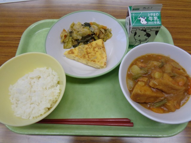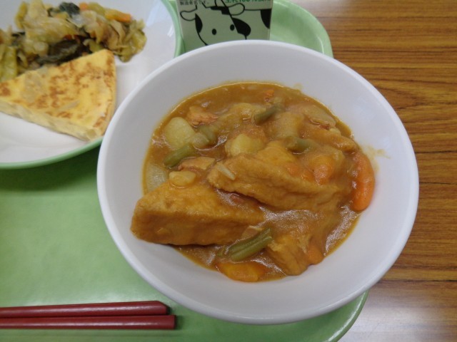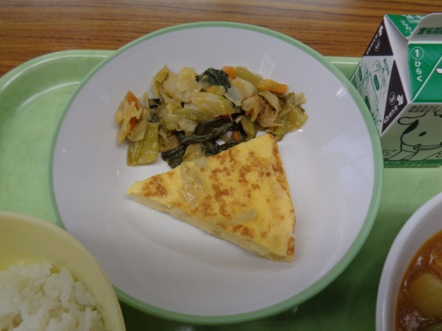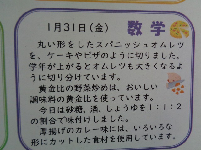 学校給食週間最終日です。今日は数学に関するメニューです。いろいろな形のものや、調味料の黄金比などが使われていました。メニューは、ごはん、牛乳、スパニッシュオムレツ、黄金比の野菜炒め、厚揚げのカレー味でした。美味しくいただきました。