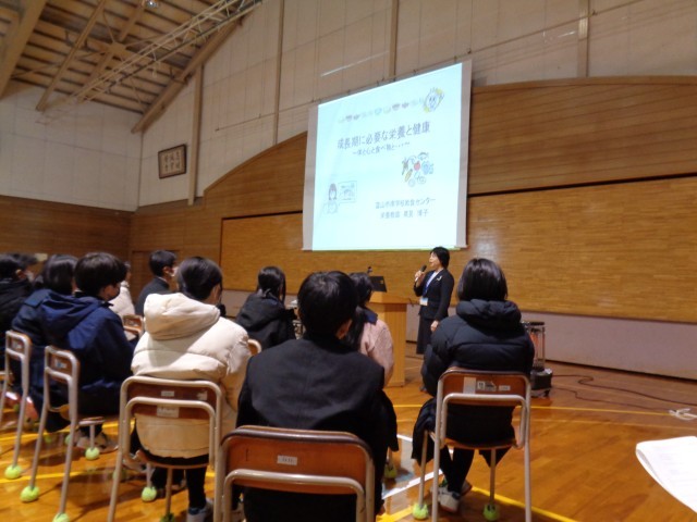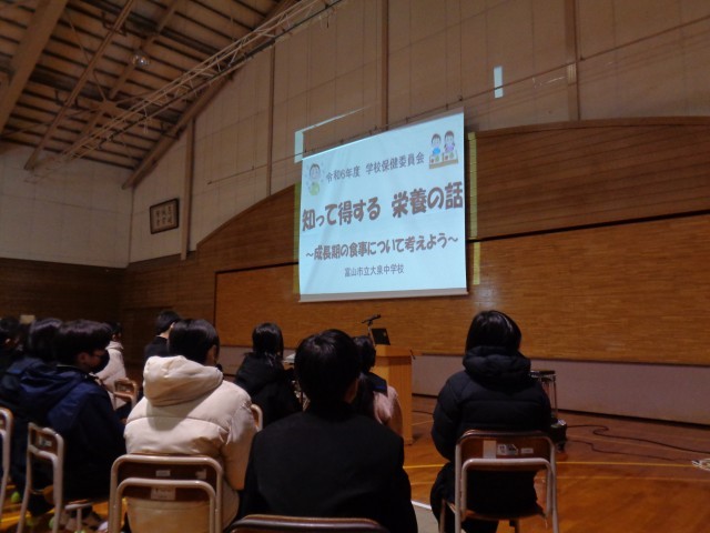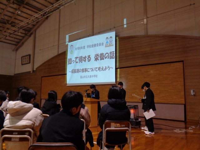 5,6限に学校保健委員会をしました。テーマは「知って得する 栄養の話~成長期の食事について考えよう~」でした。給食委員会、保健体育委員会の発表の後、栄養教諭の先生にお話いただきました。