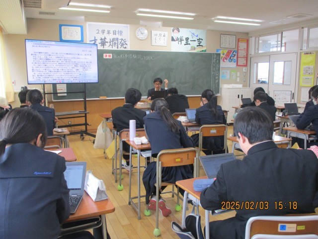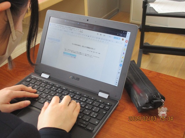 2学年では、来年度の修学旅行に向けて平和学習をしています。今日は富山大空襲の資料を学級ごとにクロムブックで読み、最後に感じたことを各自でまとめました。