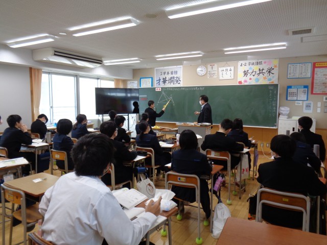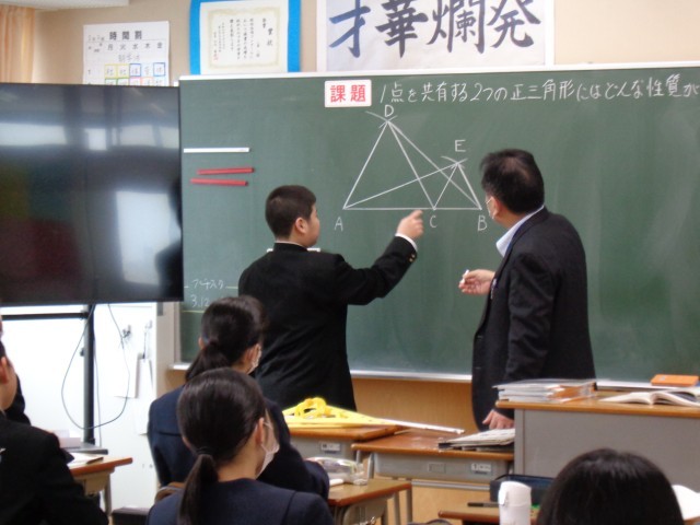 2年生の数学です。黒板の前で、説明していました。