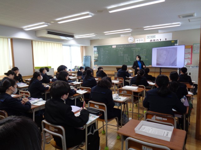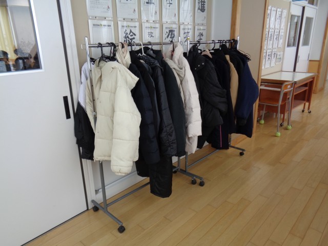 1年生の技術家庭科です。衣服に付いているタグについて学習していました。廊下には、きちんとコートがかかっていました。
