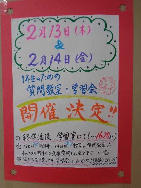 今日、明日の2日間「1年生のための質問教室、学習会」が開催されます。学年末考査に向けて積極的に参加しましょう。授業は数学の様子です。