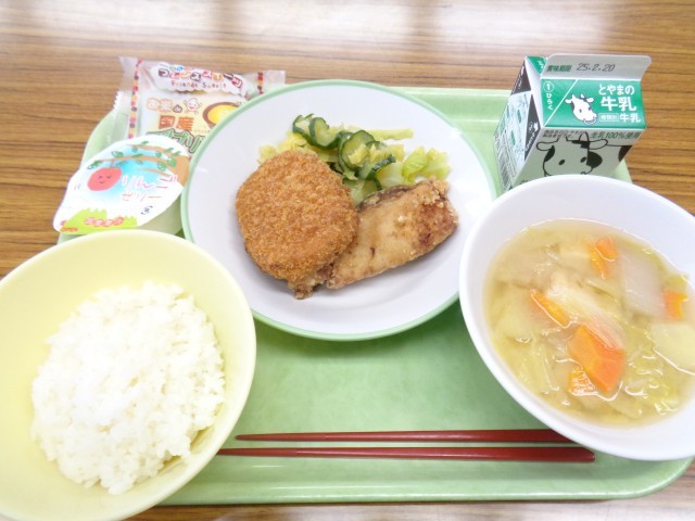 今日の給食は、選択献立です。写真はすべて盛りつけてあります。ますの竜田揚げ、肉じゃがコロッケとりんごゼリー、豆乳プリンタルトから1つずつ選びました。事前に希望調査をとっています。その他のメニューは、ごはん、牛乳、和風サラダ、具だくさん汁です。今日も美味しくいただきました。