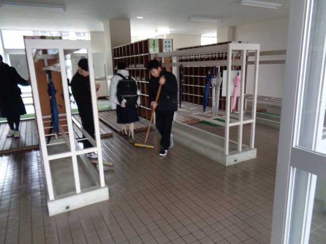 生徒玄関をボランティアで清掃していました。いつもありがとうございます。登校時間は、風が吹き少しずつ気温が下がってきているようです。今日は3年生の進路懇談会、水曜日からは学年末考査です。放課後に図書室を開放していますので、学習に活用してください。
