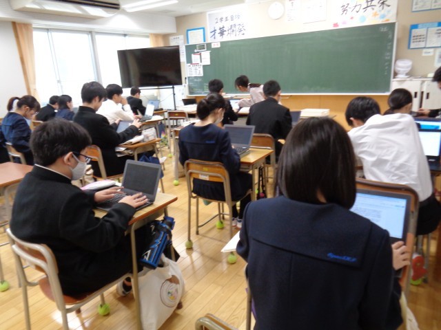 2年生は国語と理科です。国語では一人一人タブレットに文章を打ち込んでいました。理科では、発熱量について学習していました。