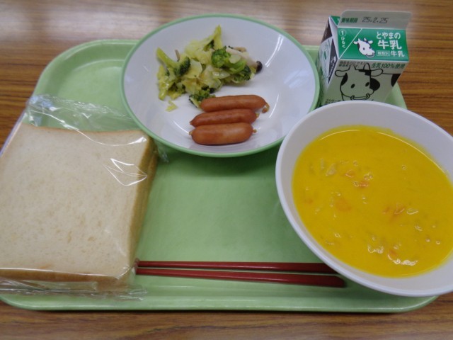 メニューは、食パン、牛乳、あらびきウインナー、ブロッコリーときのこのアヒージョ、かぼちゃのポタージュでした。美味しくいただきました。