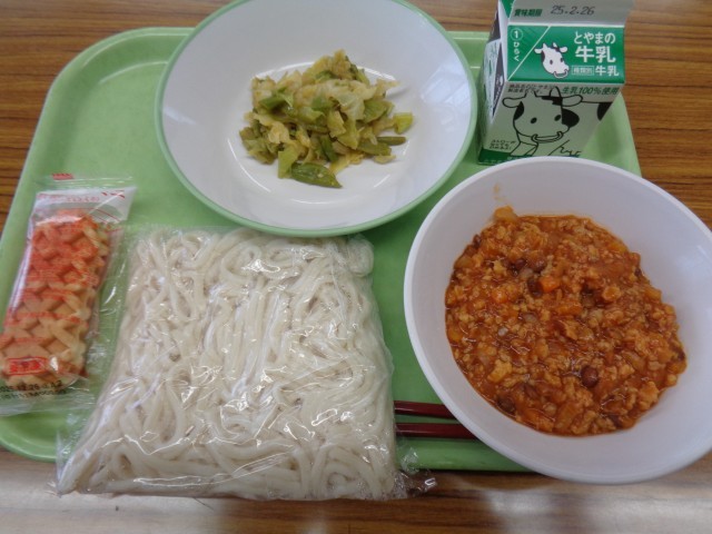 メニューは、ソフト麺、牛乳、ミートソース、チーズドック、アスパラサラダでした。3年生は、最後のソフト麺です。美味しくいただきました。