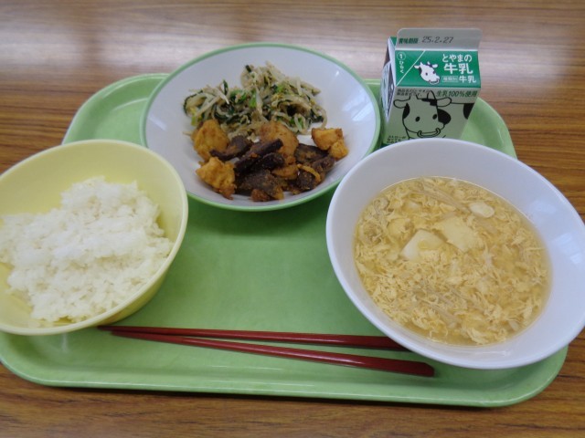 メニューはごはん、牛乳、鶏肉とレバーのカレー風味、ナムル、かきたま汁でした。今日も美味しくいただきました。
