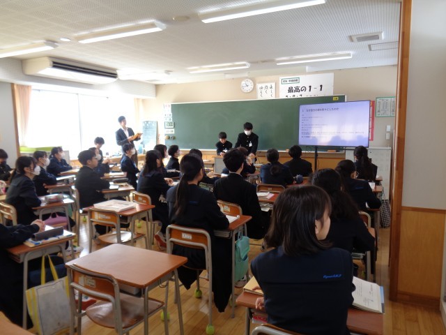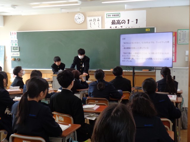 1年生は国語です。「少年の日の思い出」の文章について、読み取ったこと考えたこと等を発表しています。