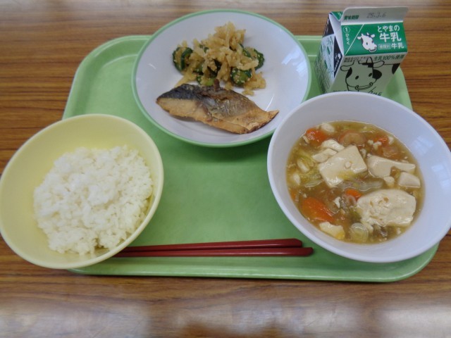 今日のメニューはごはん、牛乳、ふくらぎの西京焼き、華風和え、えびと豆腐のうま煮でした。美味しくいただきました。