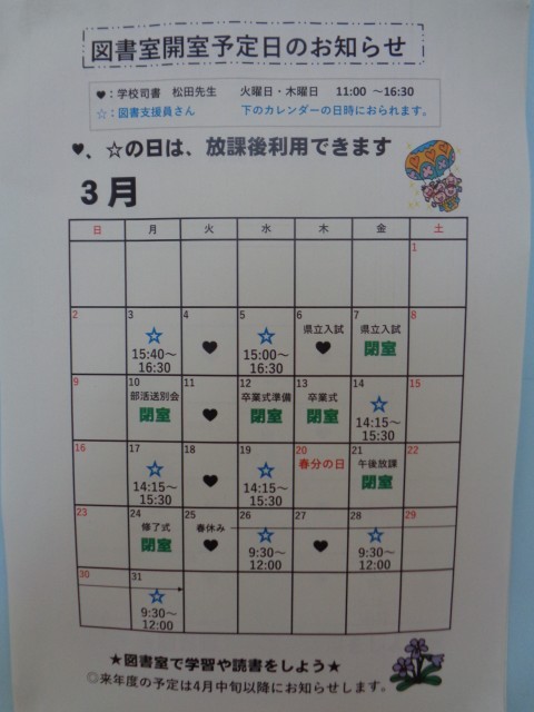 3月の図書室開室の予定です。卒業式があるので、閉室する日があります。春休みも開室するので、利用しましょう。