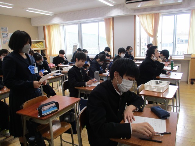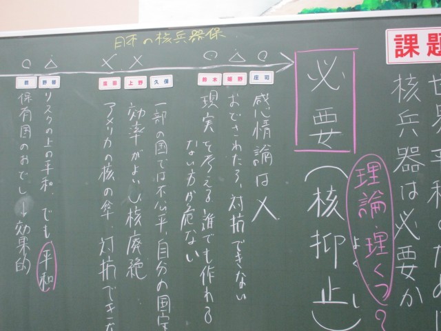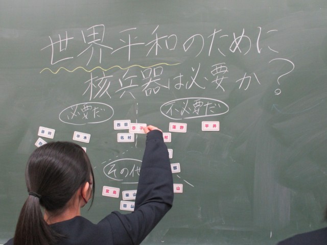 2学年では、総合的な学習の時間に来年度の修学旅行の事前学習として平和学習を行っています。今日は今年度の最終日として、「核抑止の是非」を考えました。これまで富山大空襲、広島の原爆投下等の学習を行い、戦争の恐ろしさや原爆の脅威を学んできました。その上で「核抑止の是非」について友達の意見を聞きながら一人一人が考えを深めました。