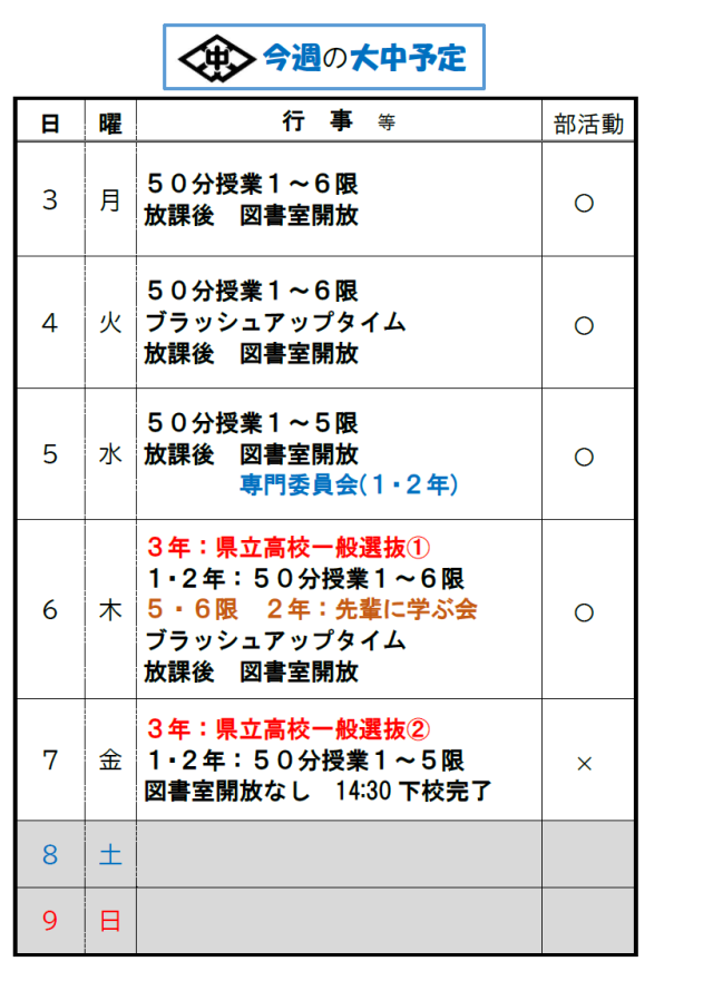 今週は、6日(木)と7日(金)に県立高校の一般入試が行われます。受験生のみなさんは、体調管理をしっかりと行い、限られた時間を有効につかって入試に臨みましょう。