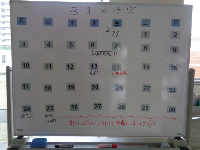 3月になりました。生徒玄関前のホワイトボードの予定が変わっていました。3年生はあと少しで卒業ですね。