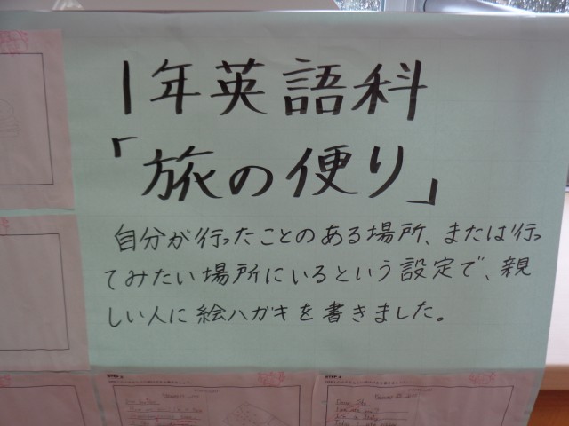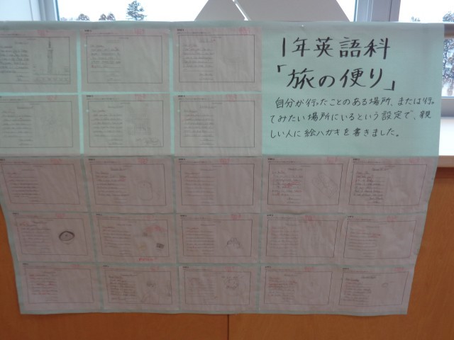1年生教室前廊下に英語科で書いた「旅の便り」が掲示されています。