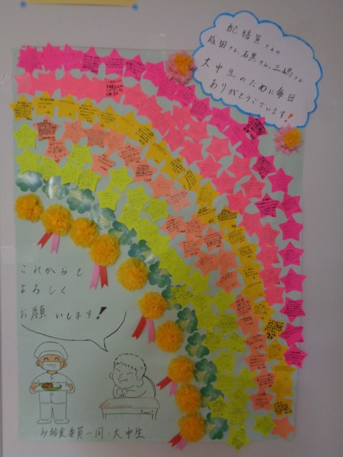 給食の配膳をしてくださる方々にメッセージを記入し、掲示しました。感謝の気持ちを伝えています