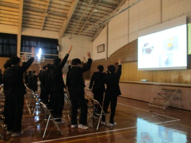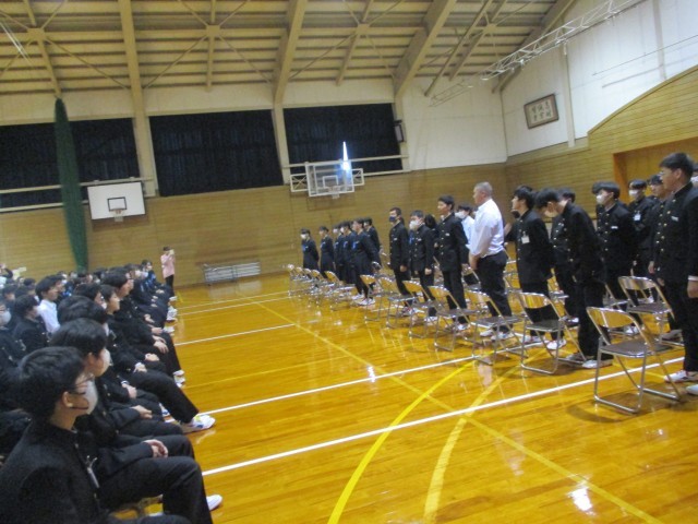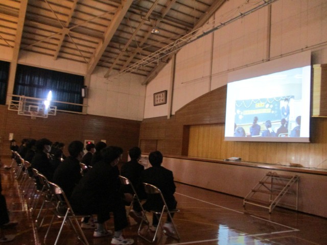 生徒会執行部が企画した「3年生を送る会」を行いました。3年間の学校行事や学校・先生方に関するクイズがあり、生徒は大盛り上がりでした。また、3年間も思い出を振り返るスライドショーでは、感動して涙ぐむ生徒もいました。たくさんの思い出を懐かしんでいる様子の3年生が多くいました。会の最後では、3年生から在校生へ感謝の思いを伝える場面もありました。