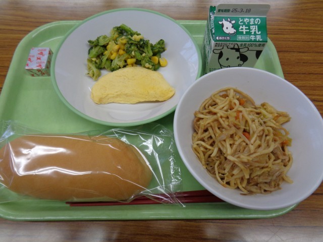 メニューはコッペパン、牛乳、焼きそば、オムレツ、コーンサラダ、ポケットチーズでした。美味しくいただきました。