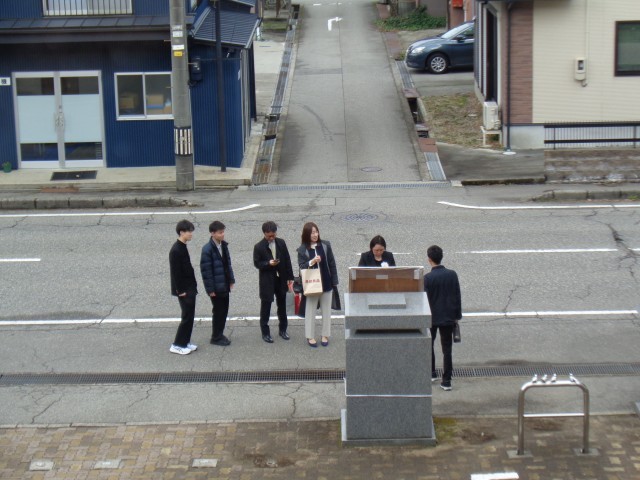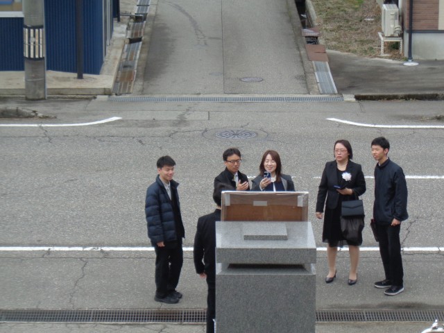 卒業生の登校時間です。思い出に看板の前で写真を撮っています。