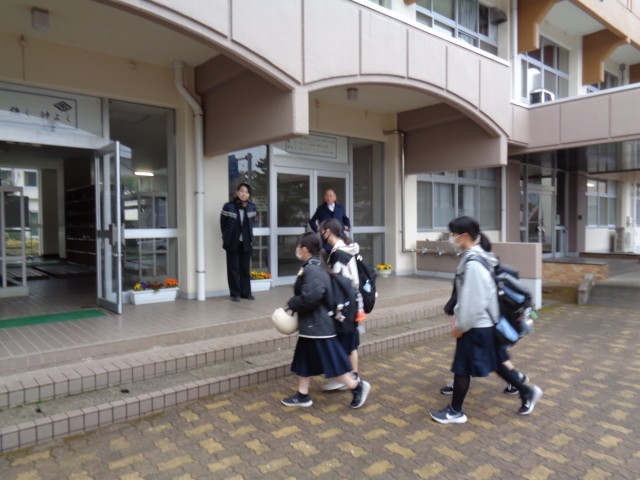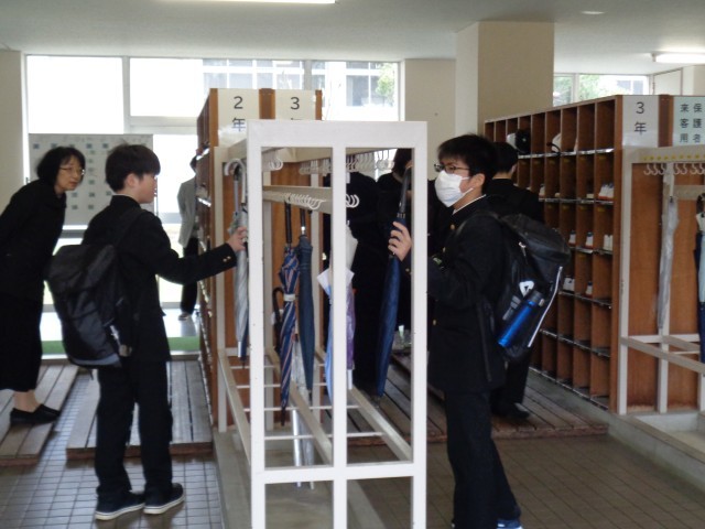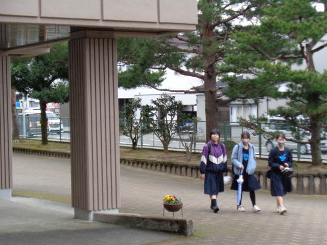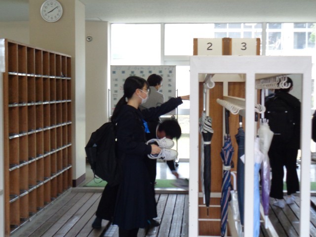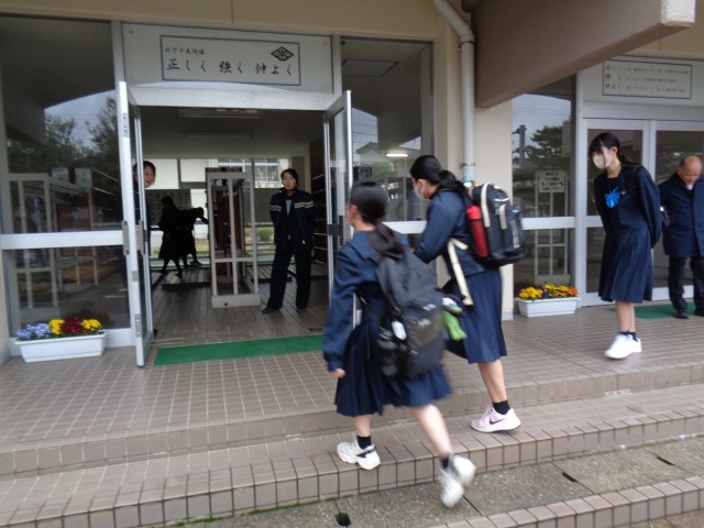 今日は寒い朝です。新学期2日目の登校です。玄関では、進級したことを忘れ?下駄箱を間違えそうになる生徒がいり、教え合っている姿が見られました。