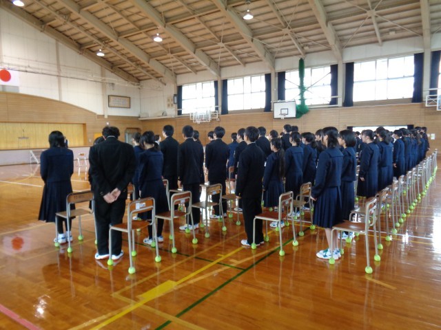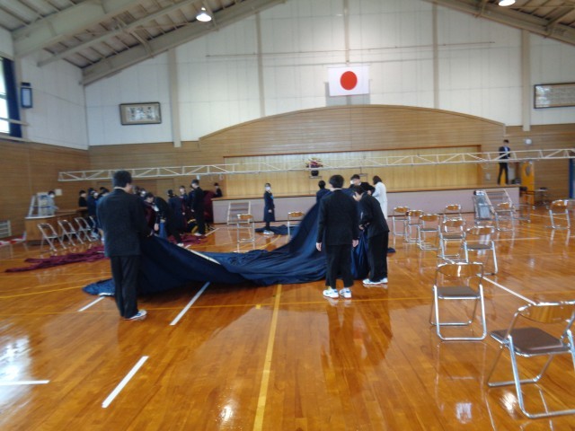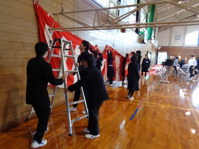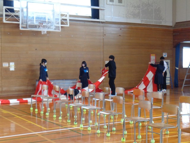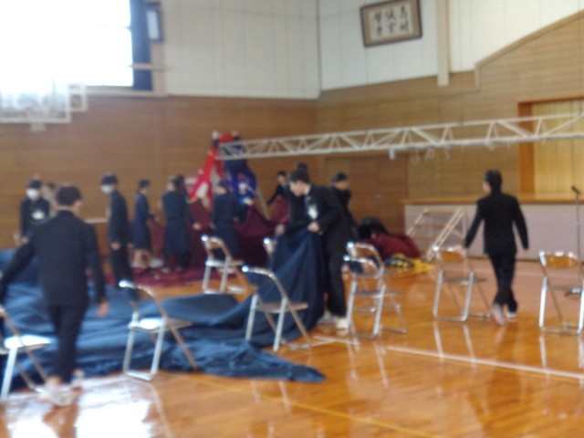明日の入学式に向けて、全校で歌唱練習をしました。その後、3年生が紅白幕等の準備をしました。