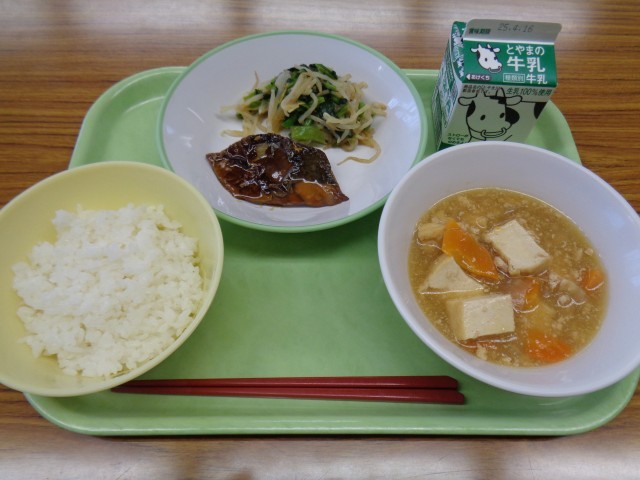 今日から給食が始まりました。今日のメニューは、ごはん、牛乳、鯵のみりん焼き、しょうがひたし、厚揚げのそぼろ煮でした。美味しくいただきました。