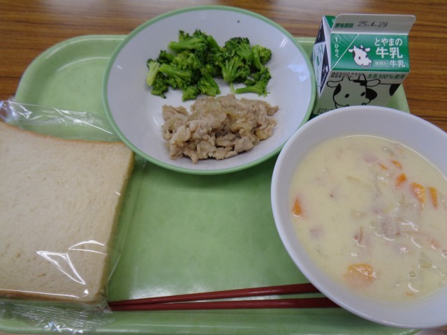 今日のメニューは、食パン、牛乳、ポークソテー、ゆでブロッコリー、クリームシチューでした。美味しくいただきました。