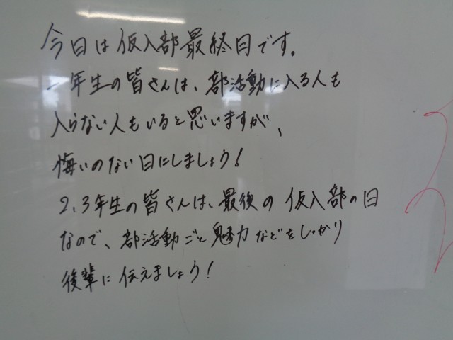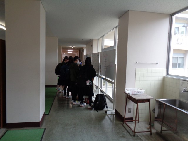 執行部の生徒が、生徒玄関前のホワイトボードにメッセージを記入しています。