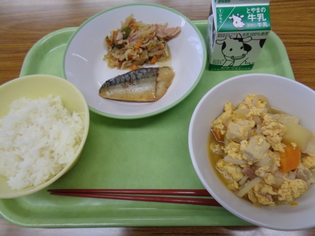 メニューはごはん、牛乳、さばのみそ煮、野菜ソテー、卵とじでした。美味しくいただきました。
