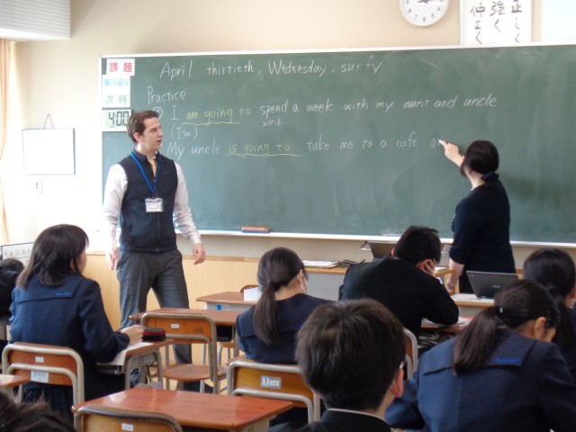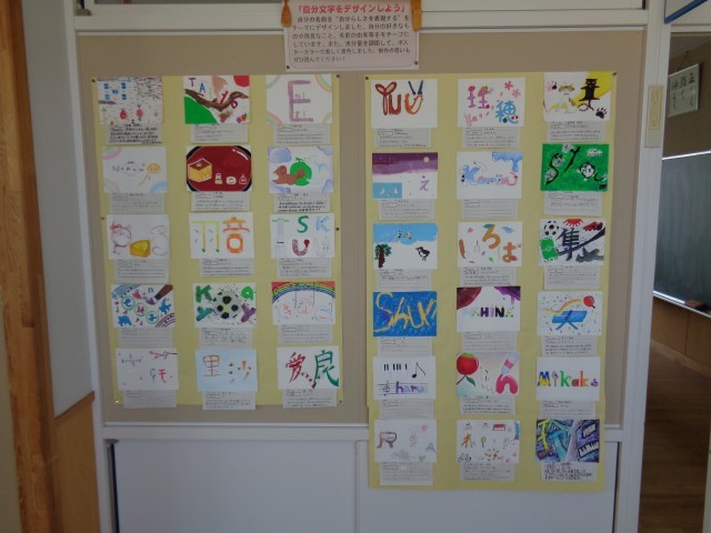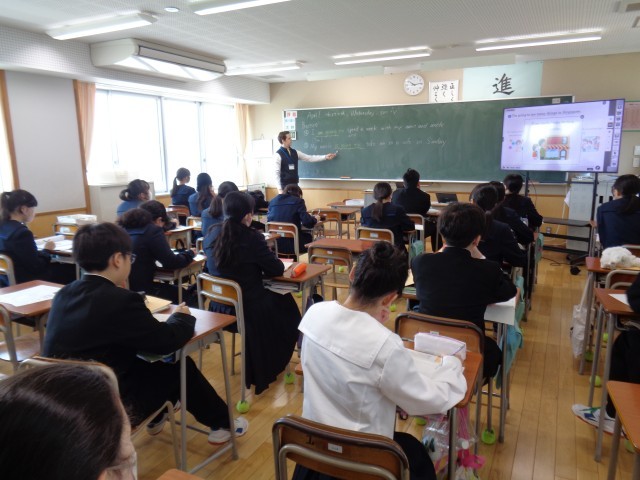 2年生は英語です。ALTの先生と一緒に学習していました。廊下の掲示では、写真から2年生の成長が見えます。美術作品は、昨年度作った作品です。
