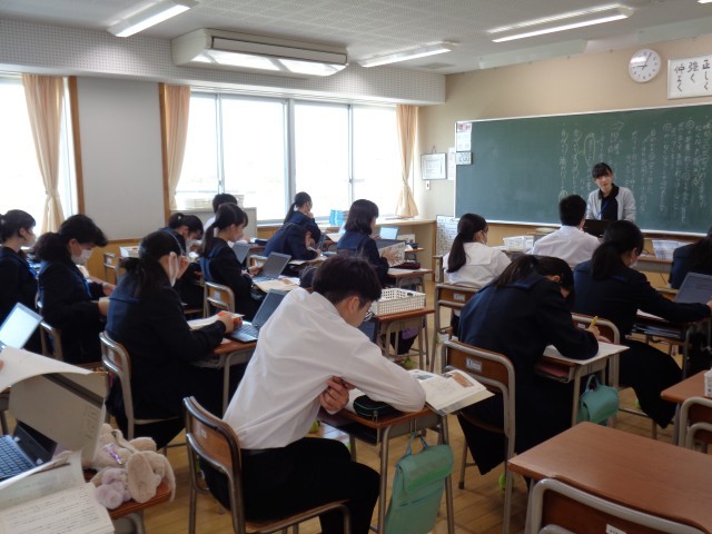 2年生は国語です。国語では、タブレットを使って授業をしています。教科書も確認しながら進めています。