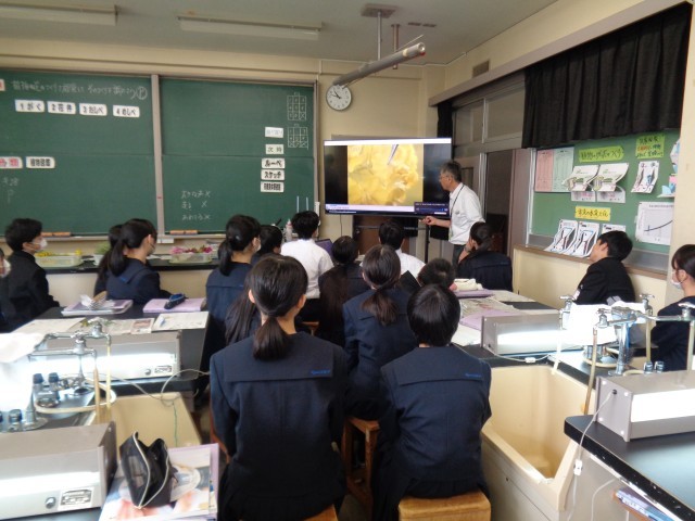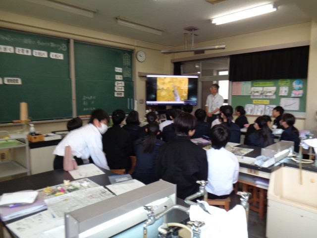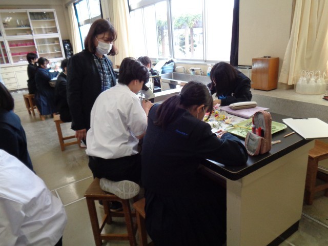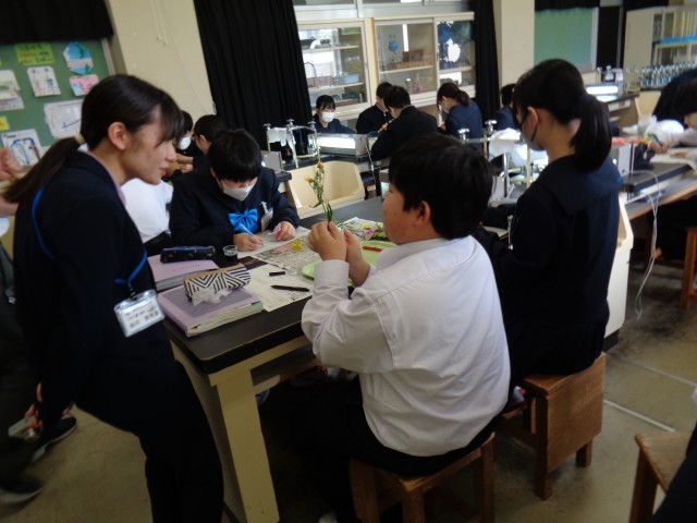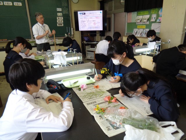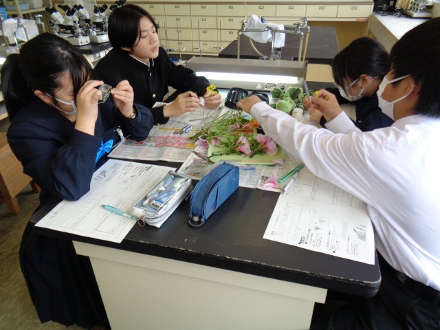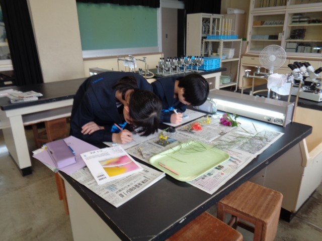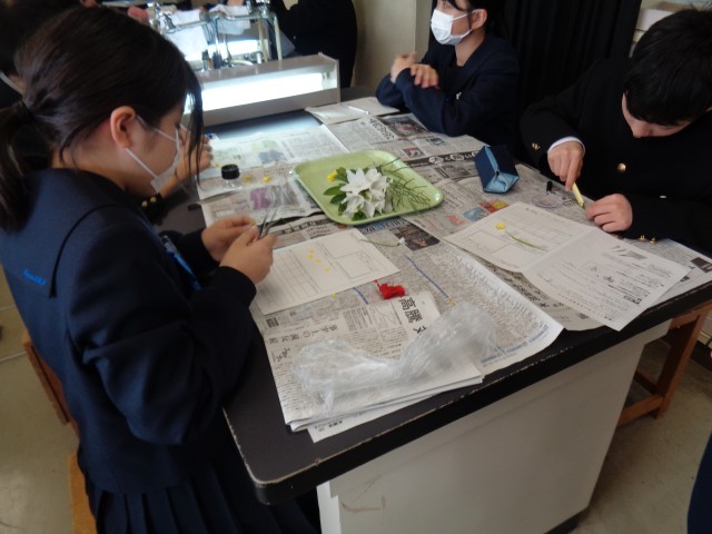 1年生の理科です。今日は理科室で、花の観察をしました。花のつくりを分解したり、ルーペで見たりして観察しました。