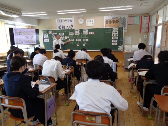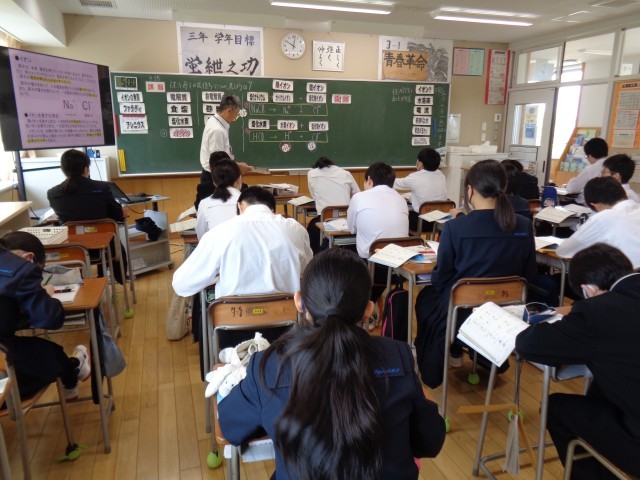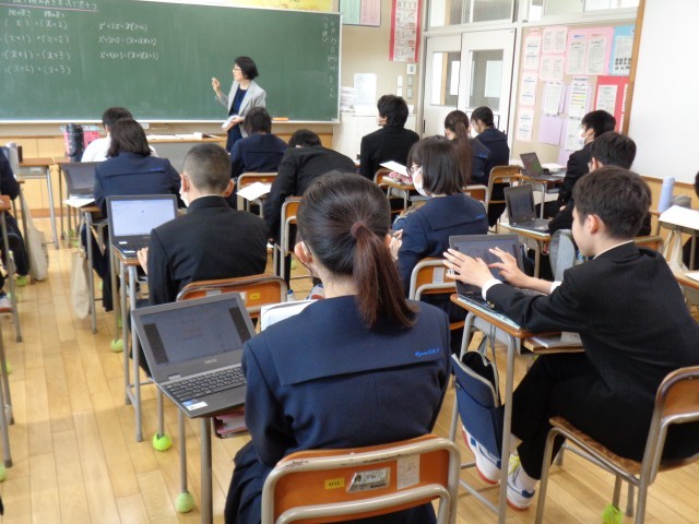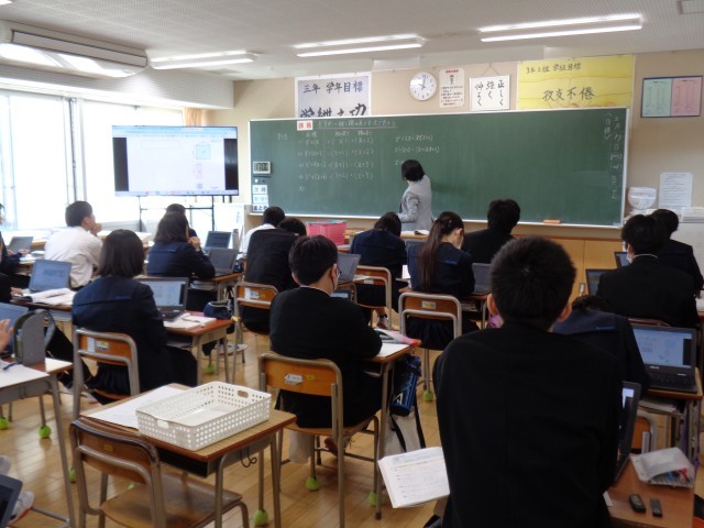 3年生の理科と数学です。理科では、電離の様子を式で表していました。数学では、タブレットを使って求め方を考えていました。