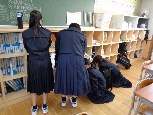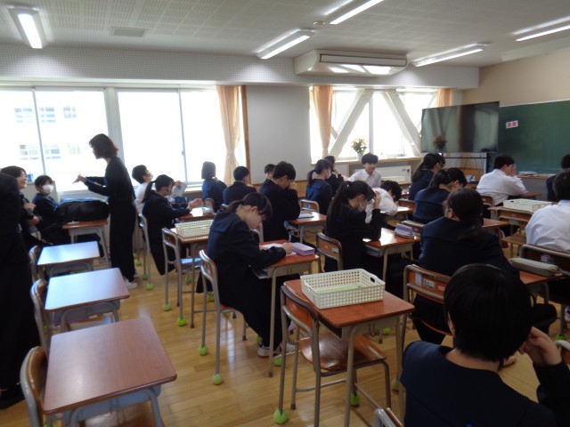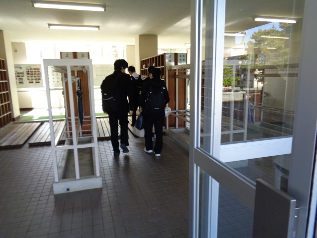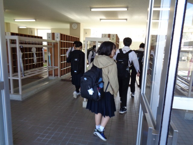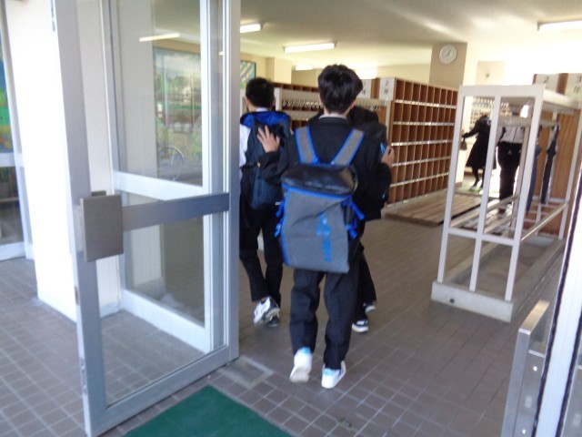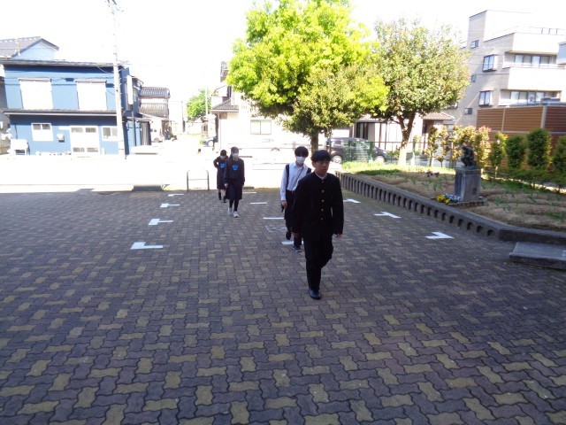 登校の様子です。とても天気がよく気持ちのよい朝です。1年生の教室では、登校したらすぐに荷物を整理していました。健康観察では、担任が一人一人の健康状態等を確認しています。