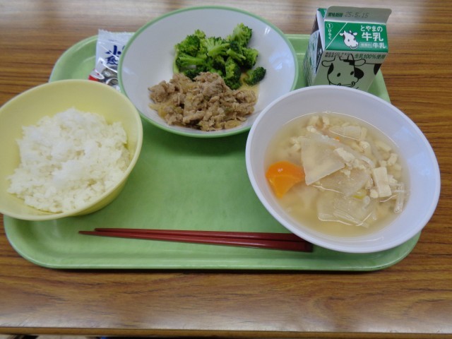 メニューは、ごはん、牛乳、焼肉、ゆでブロッコリー、みそ汁、味付け小魚でした。美味しくいただきました。