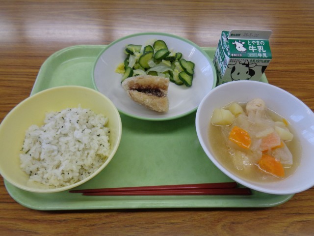 メニューは、菜めし、牛乳、あじの唐揚げ、きざみ和え、和風ポトフでした。美味しくいただきました。