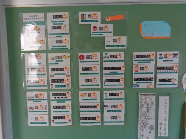 理科室前の掲示が変わりました。2年生、3年生が化学の学習をしています。元素記号を確認しましょう。