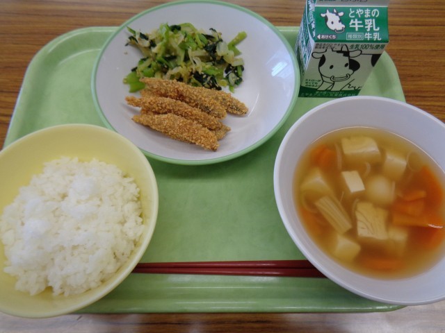 メニューは、ごはん、牛乳、きびなごのさくさく揚げ、ごまびたし、白玉汁でした。おいしくいただきました。