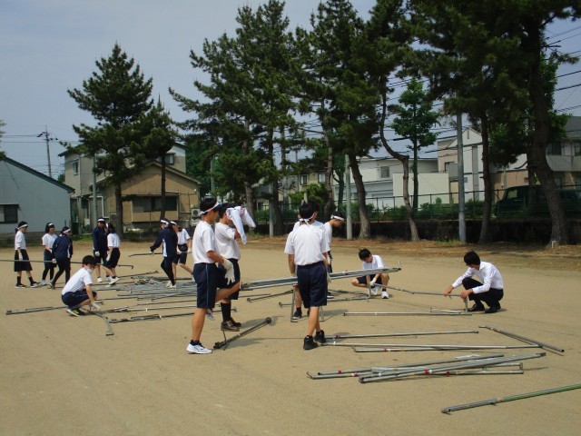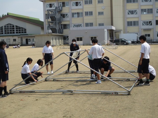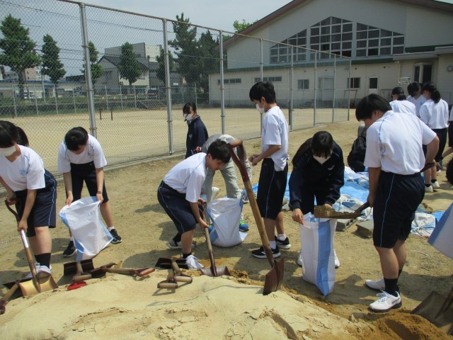 今日の5限に全校一斉で体育大会の準備を行いました。1年生は土のう作り、2・3年生はテント設置を行いました。一生懸命に準備をする姿に、体育大会を成功させようという気持ちが伝わってきました。