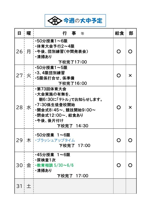 来週5/26~の大中の予定をお知らせします。