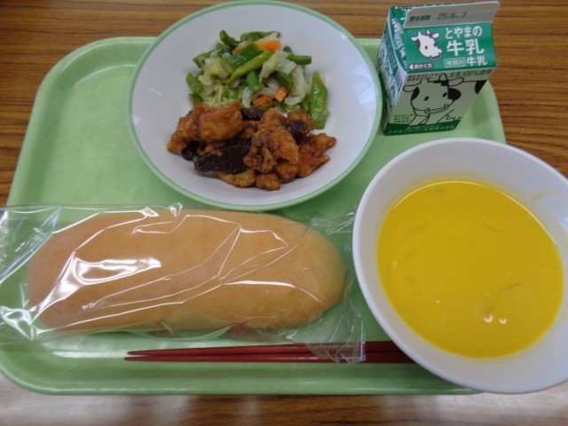 メニューはコッペパン、牛乳、鶏肉とレバーのカレー風味、イタリアンサラダ、カボチャポタージュでした。美味しくいただきました。