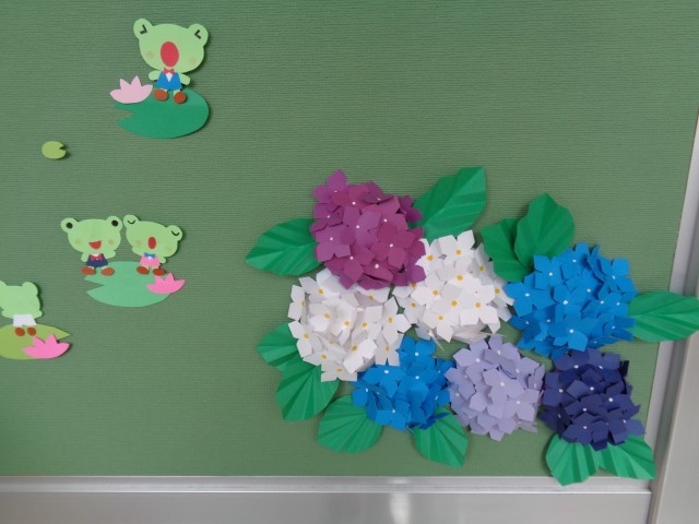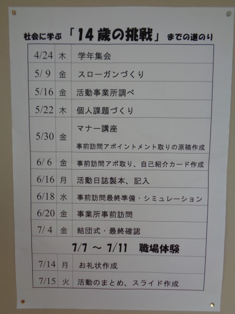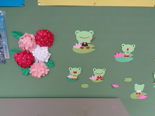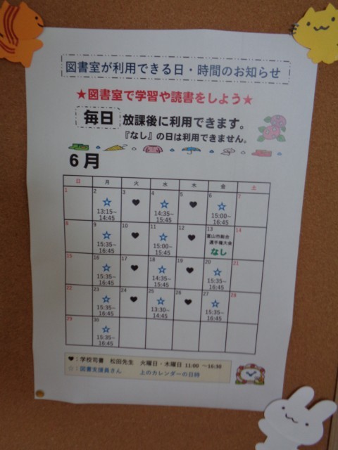 6月になったので、掲示が変わりました。まもなく梅雨になりますね。図書室開館のお知らせや2年生の14歳の挑戦スケジュールなどが掲示されました。