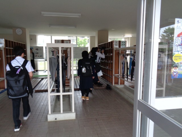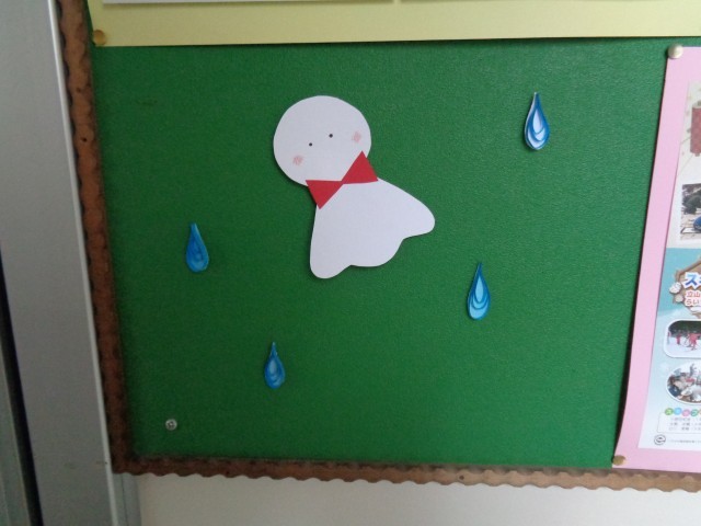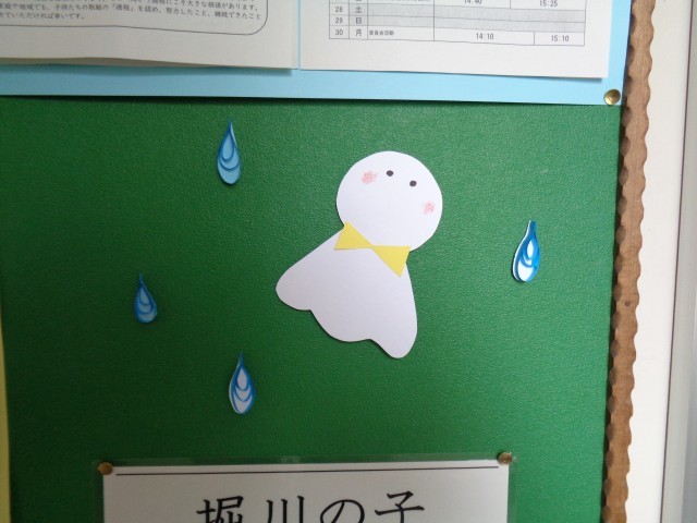 登校の様子です。今日は雨が降る予報が出ています。職員室前の掲示がてるてるぼうずになっていました。晴れるといいですね。