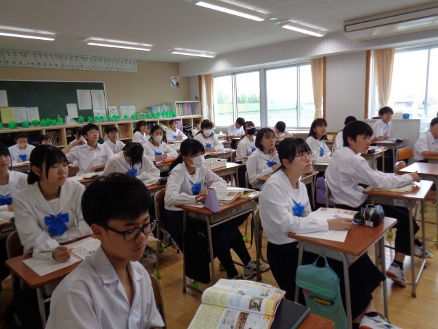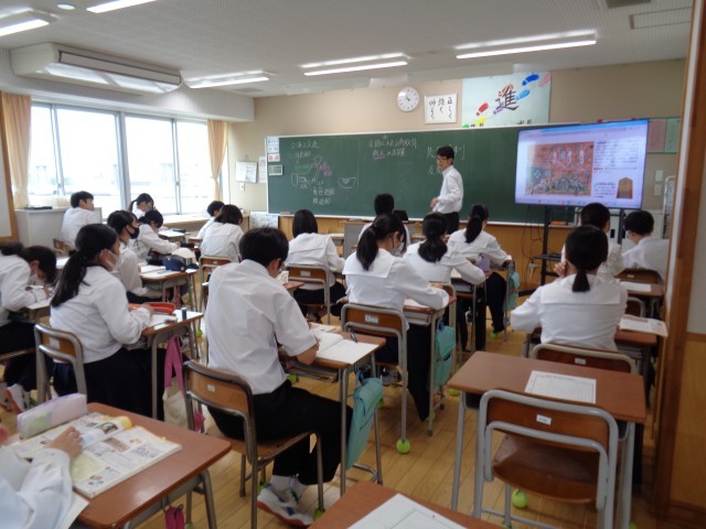2年生は社会です。しっかりノートをとりながら授業に取り組んでいます。