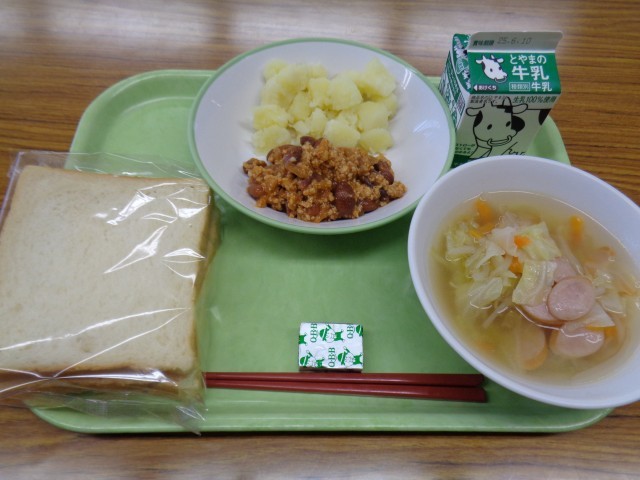 今日のメニューは食パン、牛乳、チリコンカン、こふきいも、キャベツスープ、ポケットチーズでした。美味しくいただきました