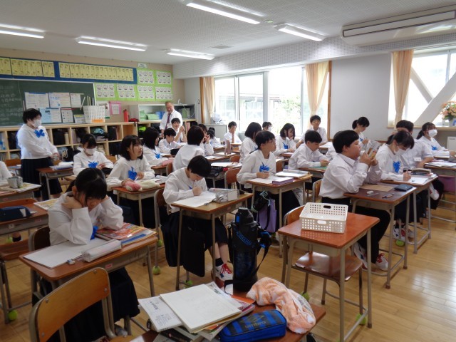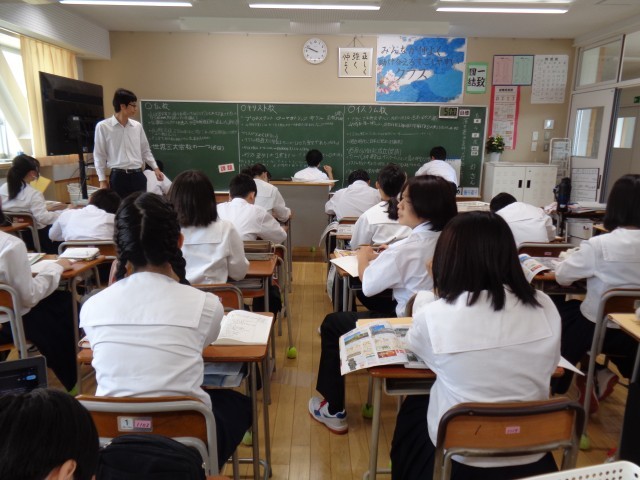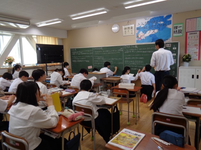 1年生の社会です。宗教について調べたことを、みんなで協力して黒板に記入しています。