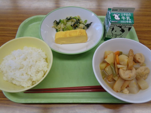 今日のメニューは、ごはん、牛乳、厚焼き卵、青菜のごまあえ、関東だきでした。美味しくいただきました。