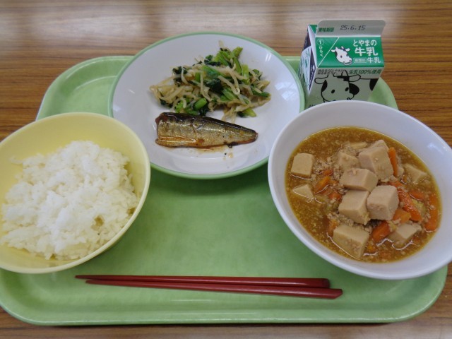 今日のメニューは、ごはん、牛乳、いわしの土佐煮、小松菜ひたし、高野豆腐のごまみそマーボーでした。美味しくいただきました。