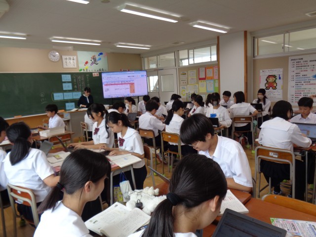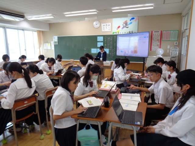 2年生の国語です。班で話し合いながら、クロームブックに書き込んでいます。