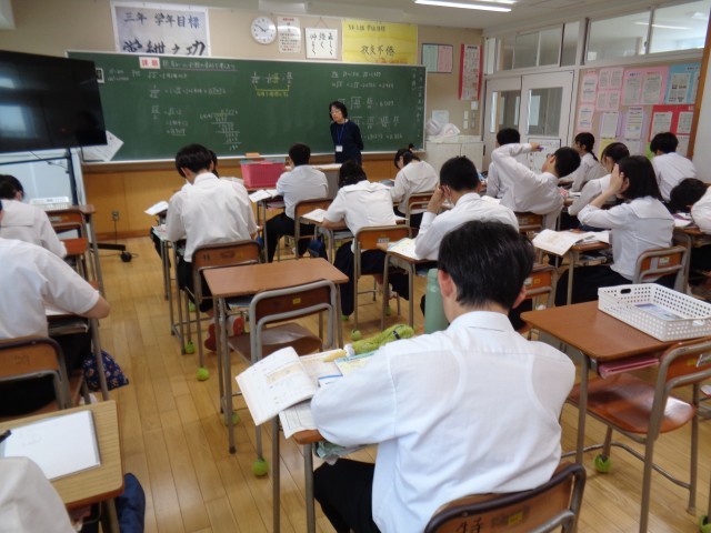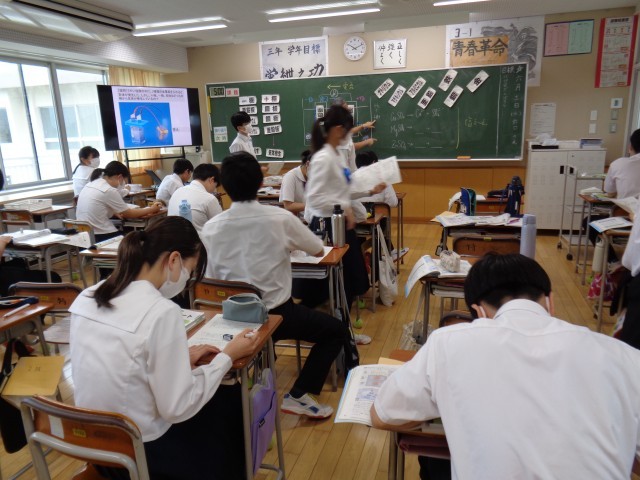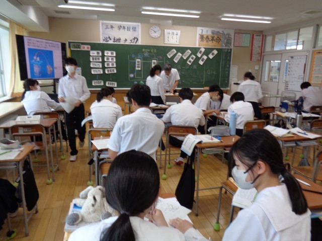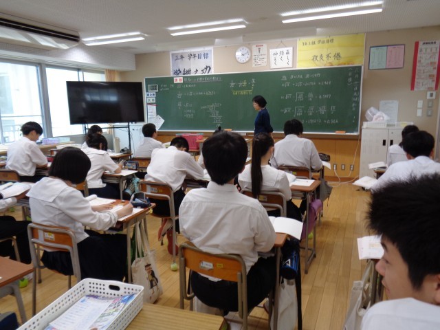 3年生の理科と数学です。理科では実験の説明を考え、先生の確認してもらっています。教え会いながら進めています。数学では、根号を使った計算に集中して取り組んでいました。